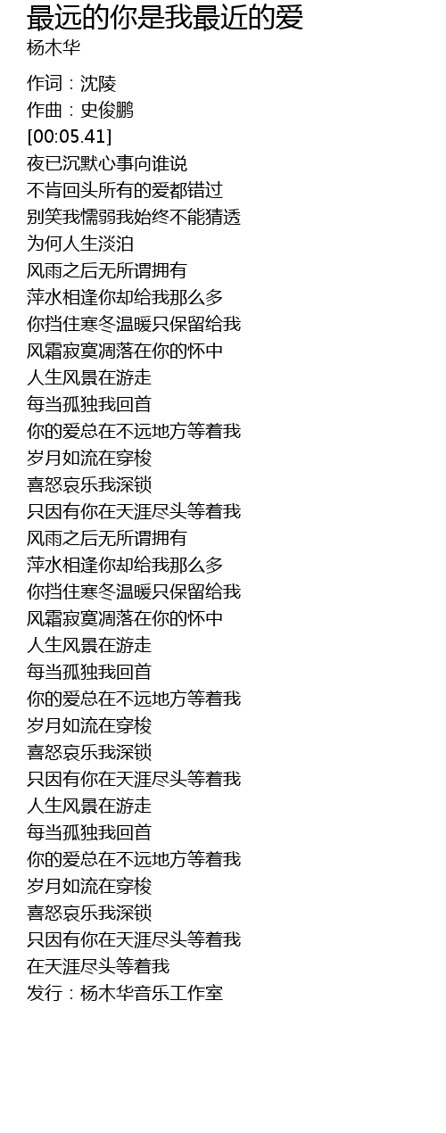 | [04:14.96] | 发行:杨木华音乐工作室 |