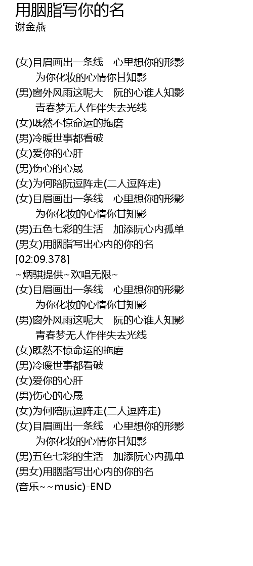 | [01:54.850] | nán nǚ yòng yān zhī xiě chū xīn nèi de nǐ de míng |