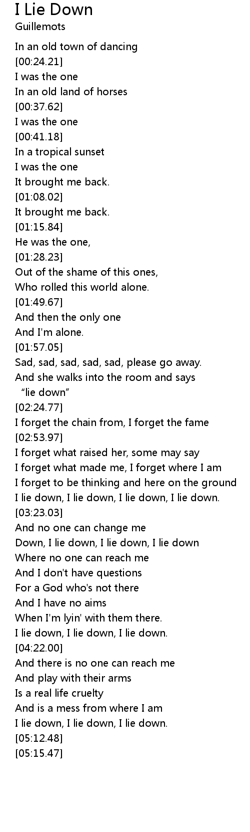 | [05:04.93] | I lie down, I lie down, I lie down. |