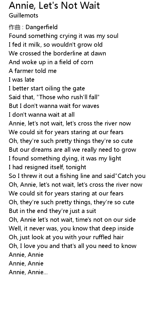 | Oh, Annie let' s not wait, time' s not on our side | |