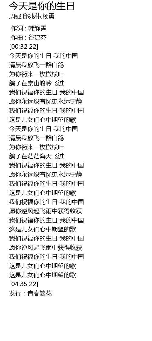 | [02:35.22] | wǒ men zhù fú nǐ de shēng rì wǒ de zhōng guó |