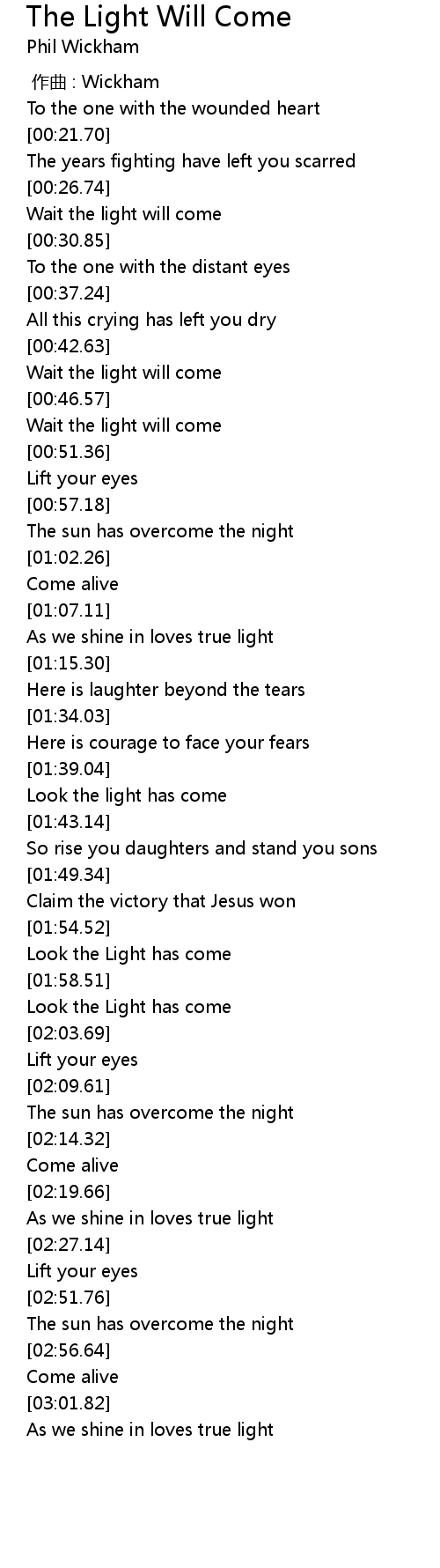 | [01:55.94] | Look the Light has come |