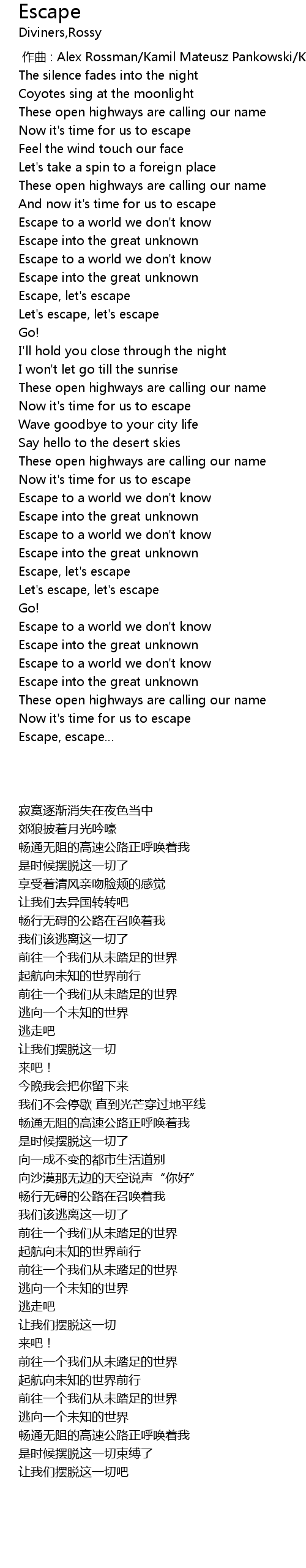 | [02:34.553] | Escape, let' s escape |