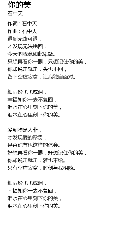 | 泪水在心里刻下你的美, | |