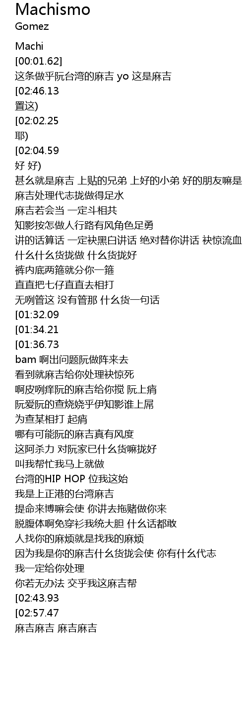 | [00:02.49] | 这条做乎阮台湾的麻吉 yo 这是麻吉 |