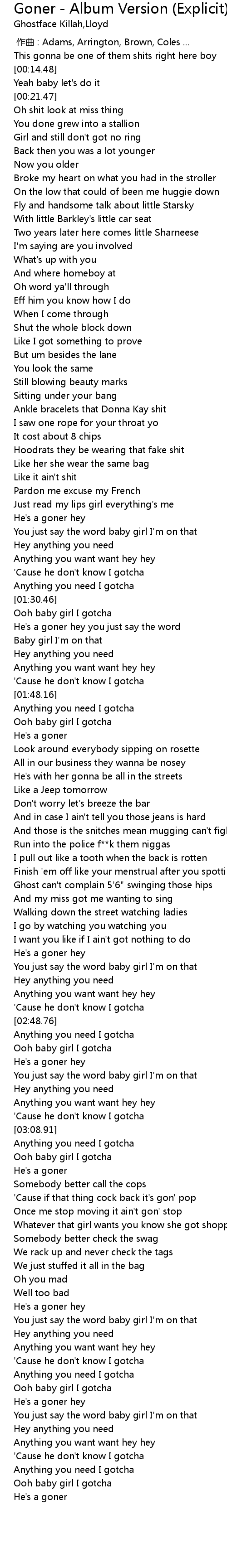 | [02:16.27] | Finish 'em off like your menstrual after you spotting |