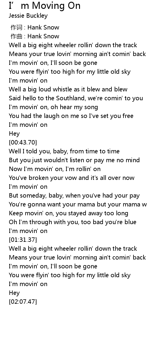 | [00:14.74] | I' m movin' on, I' ll soon be gone |