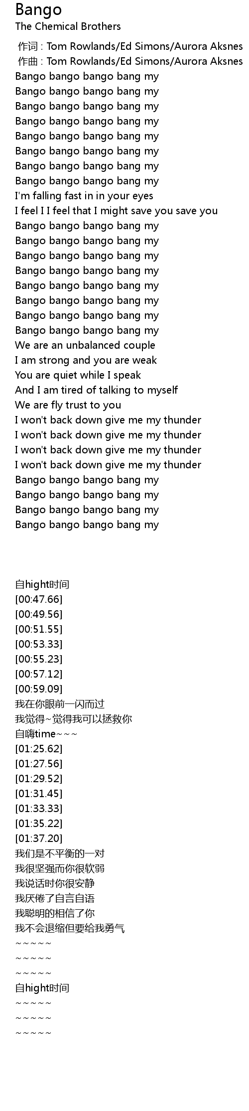 | [00:00.000] | 作词 : Tom Rowlands/Ed Simons/Aurora Aksnes |