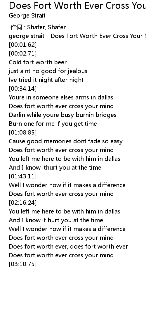 | [00:00.49] | george strait Does Fort Worth Ever Cross Your Mind |