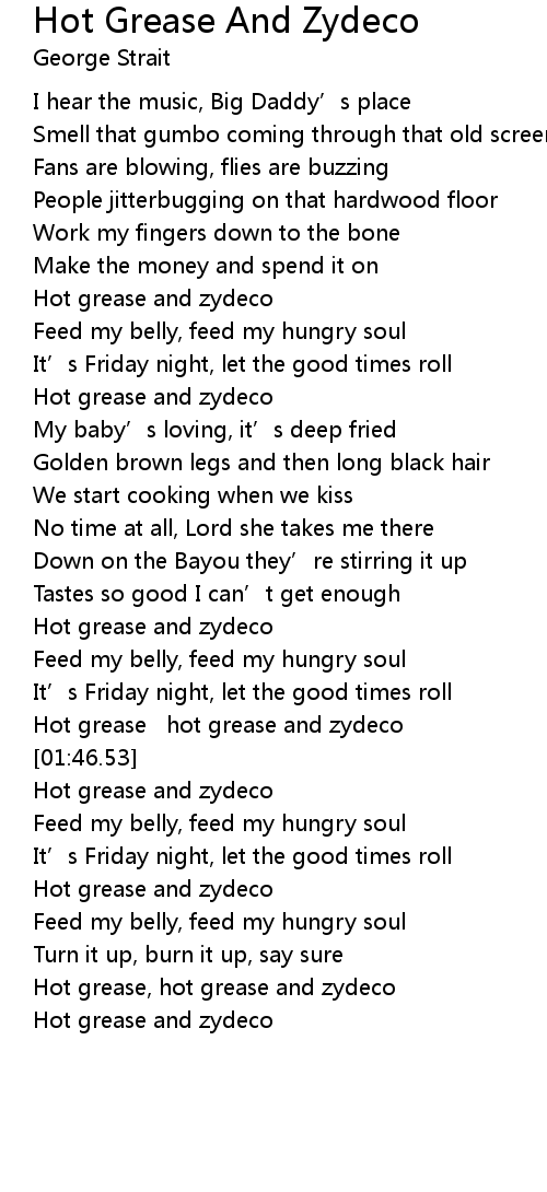 | [01:43.48] | Hot grease hot grease and zydeco |