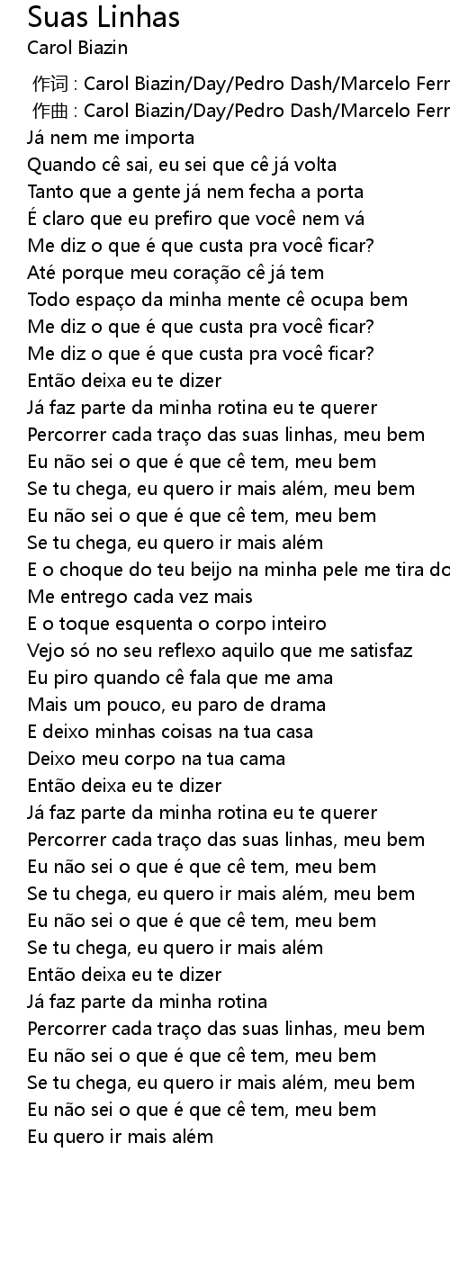 | [00:00.000] | zuò cí : Carol Biazin Day Pedro Dash Marcelo Ferraz Dan Valbusa |