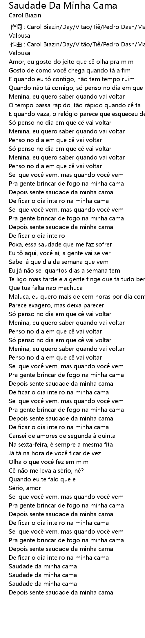 | [00:01.000] | zuo qu : Carol Biazin Day Vit o Ti Pedro Dash Marcelo Ferraz Dan Valbusa |