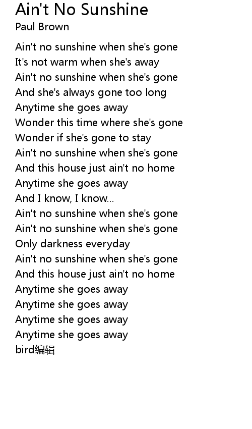 | [00:13] | Ain' t no sunshine when she' s gone |