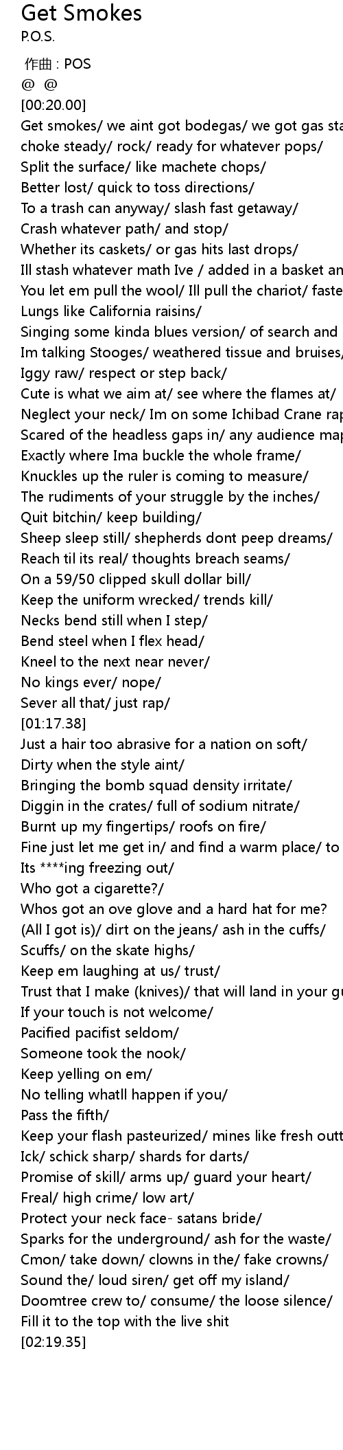 | [00:20.91] | Get smokes/ we aint got bodegas/ we got gas stations/ |