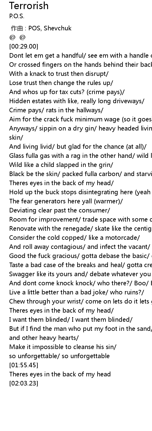 | [00:59.48] | Theres eyes in the back of my head |