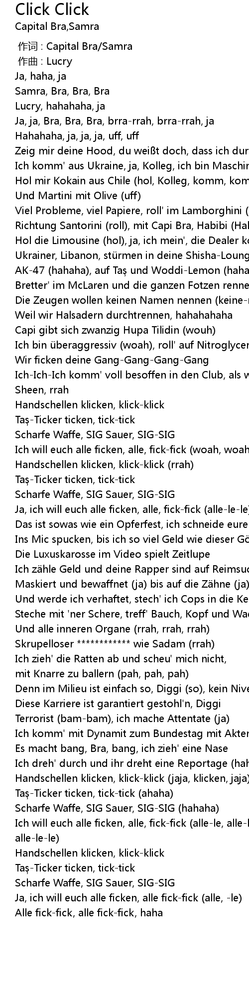| [01:51.76] | Und werde ich verhaftet, stech' ich Cops in die Kehle (alle-le) |