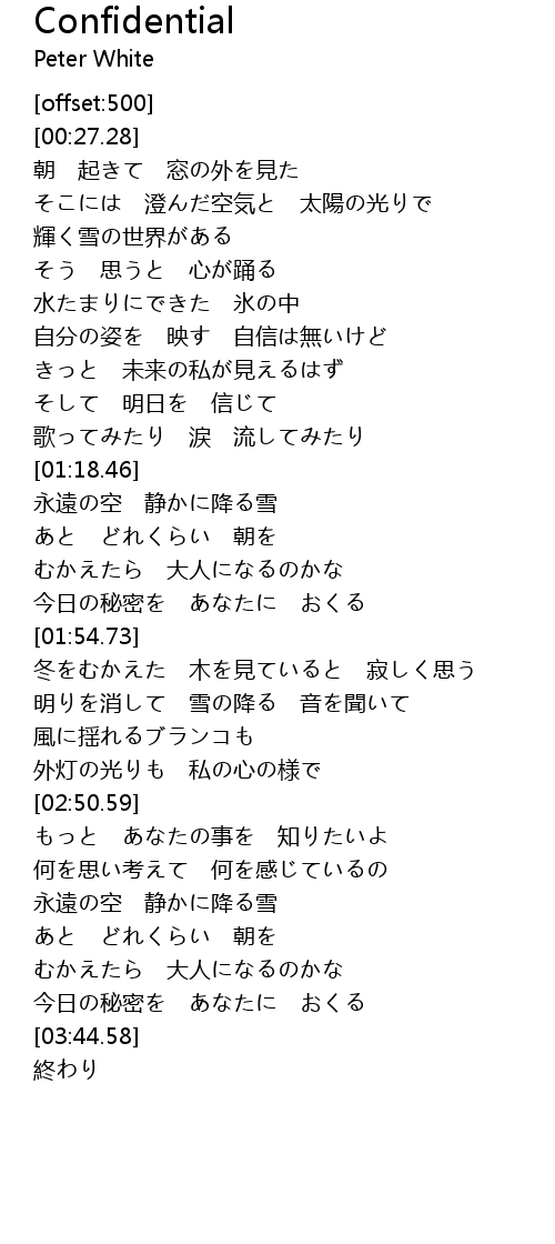 | [03:37.31] | 今日の秘密を あなたに おくる |
