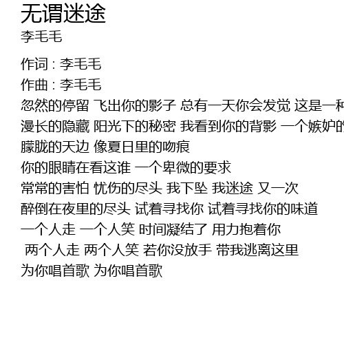 | 常常的害怕 忧伤的尽头 我下坠 我迷途 又一次 醉倒在夜里的尽头 试着寻找你 试着寻找你的味道 | |