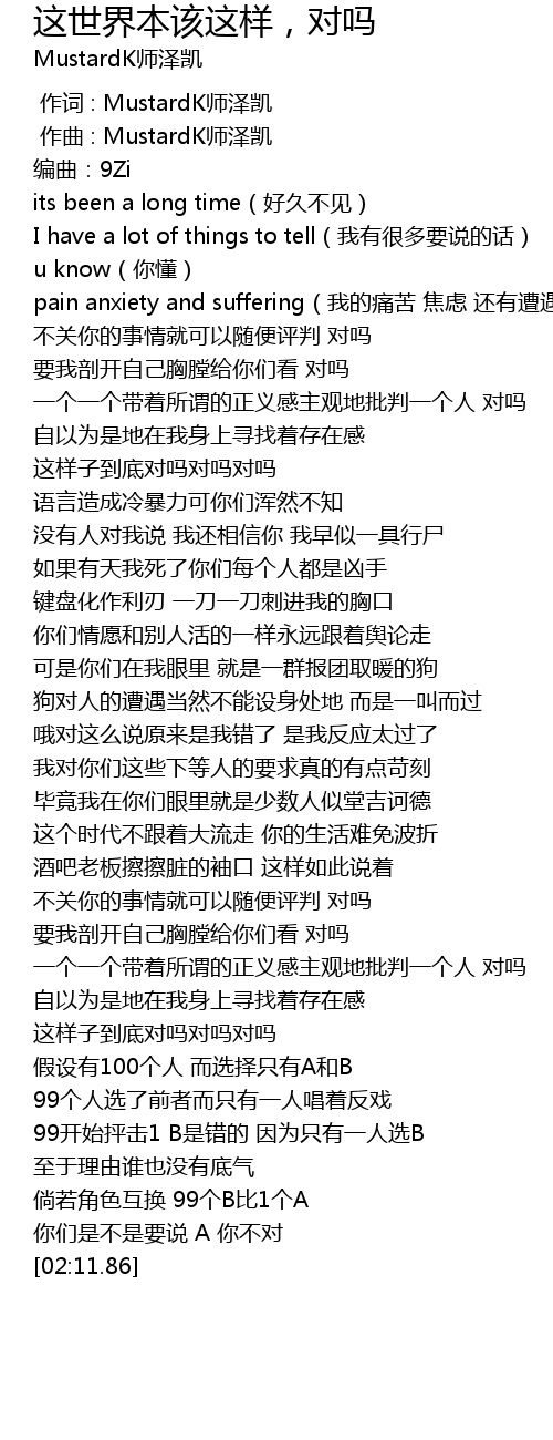 | [00:00.000] | 作词 : MustardK师泽凯 |