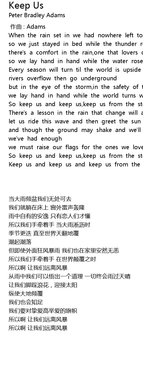 | [02:53.86] | So keep us and keep us,keep us from the storm. |