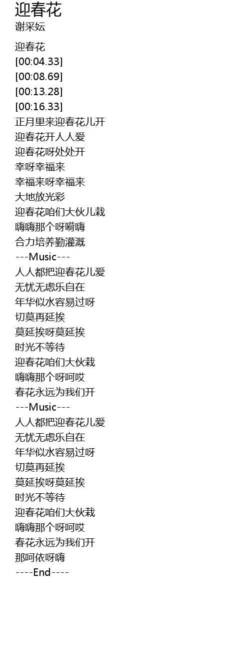 | [01:00.29] | 人人都把迎春花儿爱 |