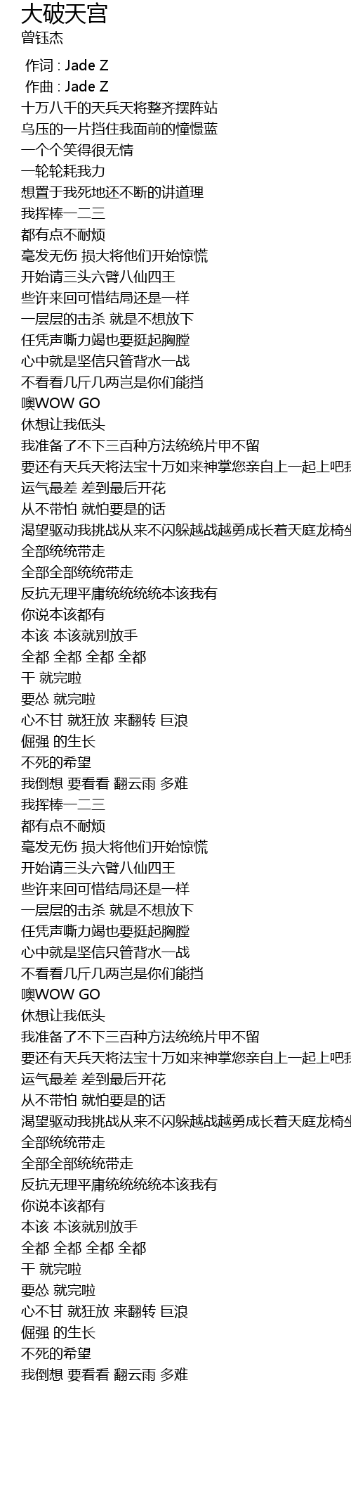 | [00:46.700] | 要还有天兵天将法宝十万如来神掌您亲自上一起上吧我都不能等太久 |