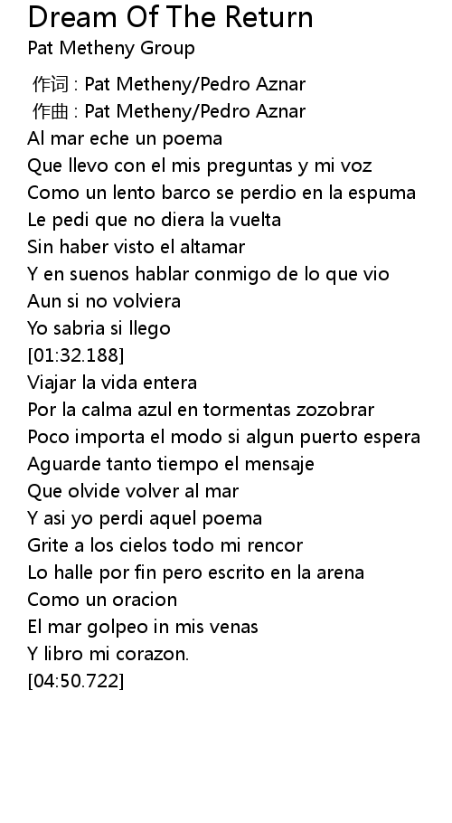 | [00:00.000] | zuò cí : Pat Metheny Pedro Aznar |