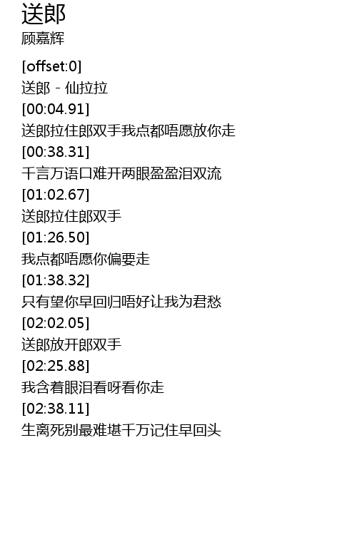 | [00:14.14] | 送郎拉住郎双手我点都唔愿放你走 |