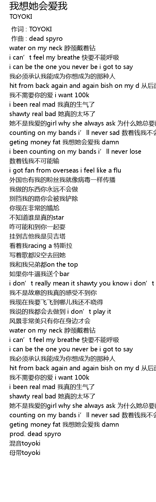 | [00:34.436] | geting money fat wǒ xiǎng tā huì ài wǒ damn |