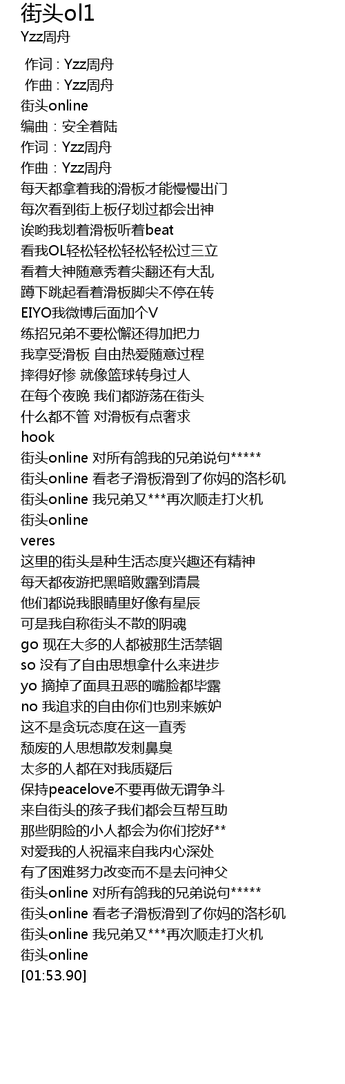 | [01:35.69] | 街头online 对所有鸽我的兄弟说句***** |
