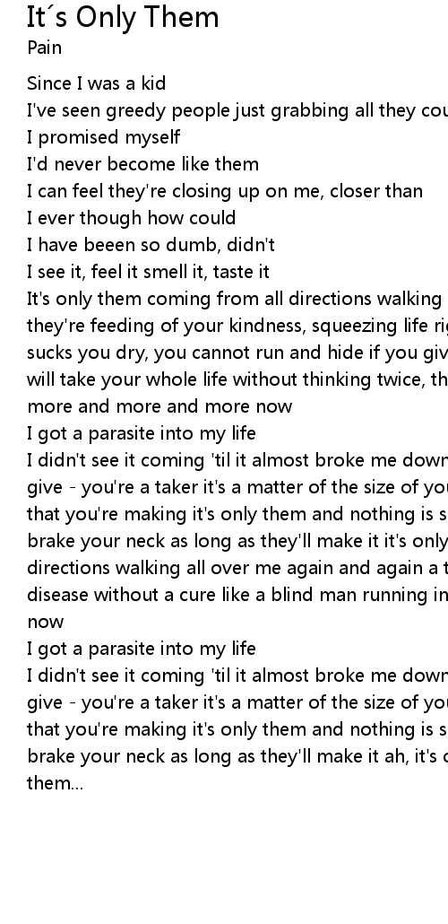 It's only them coming from all directions walking all over me again and again they're feeding of your kindness, squeezing life right out of you like a vampire sucks you dry, you cannot run and hide if you give them a helping hand, they will take your whole life without thinking twice, the only thing they want is more and more and more now