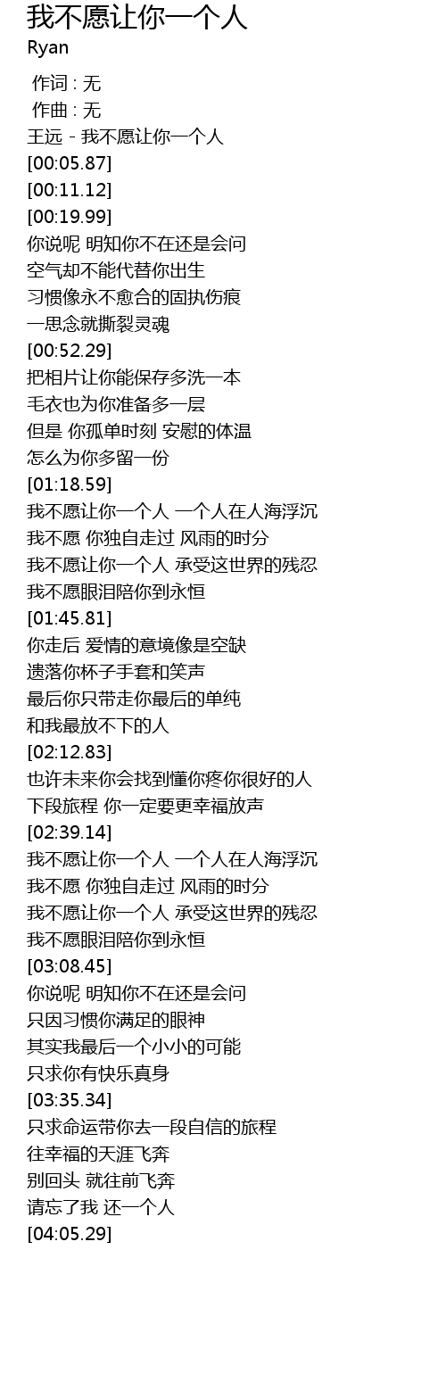 | [00:00.13] | 王远 - 我不愿让你一个人 |