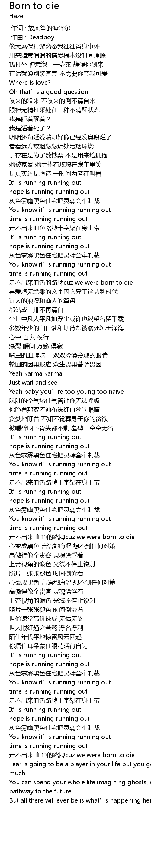 | [01:25.001] | 走不出来血色的路牌cuz we were born to die |