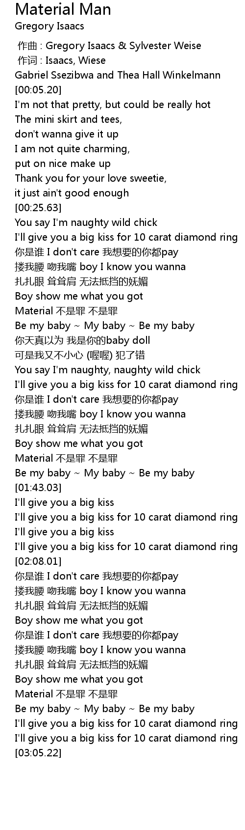 | [03:01.56] | I'll give you a big kiss for 10 carat diamond ring |
