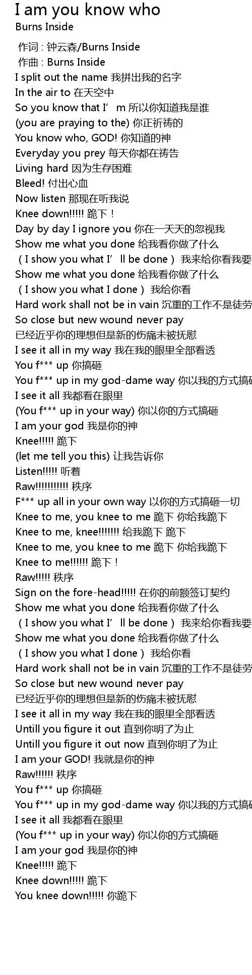 | [00:08.365] | You know who, GOD! nǐ zhī dào de shén |