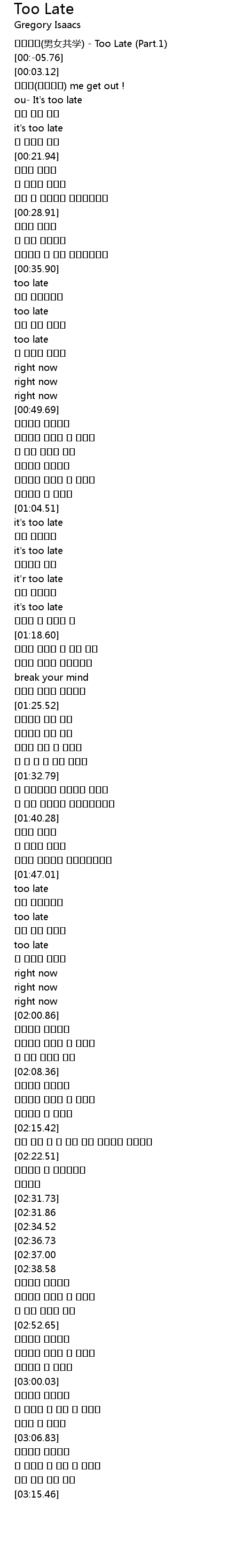 | [00:-07.05] | 남녀공학(男女共学) - Too Late (Part.1) |
