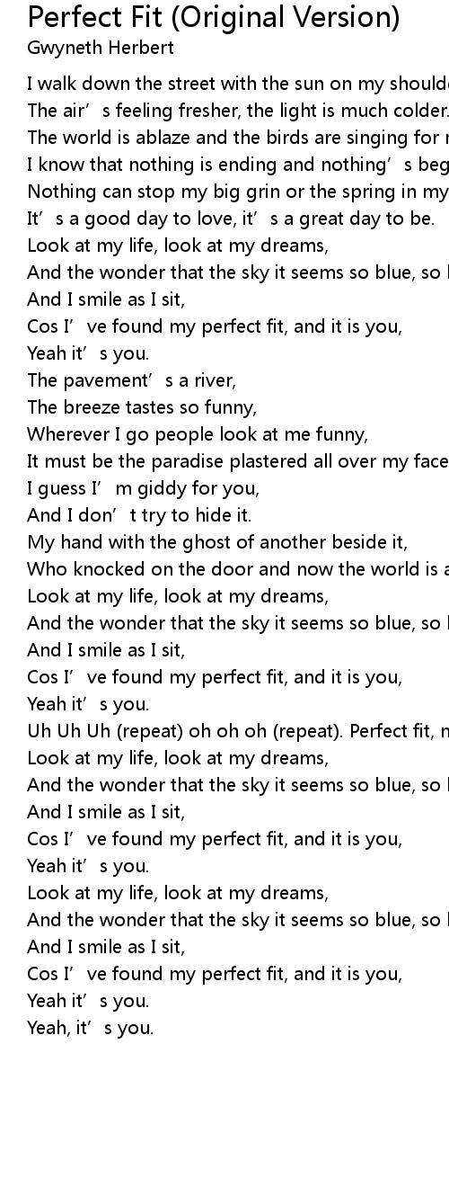 | Uh Uh Uh repeat oh oh oh repeat. Perfect fit, my perfect fit repeat. | |