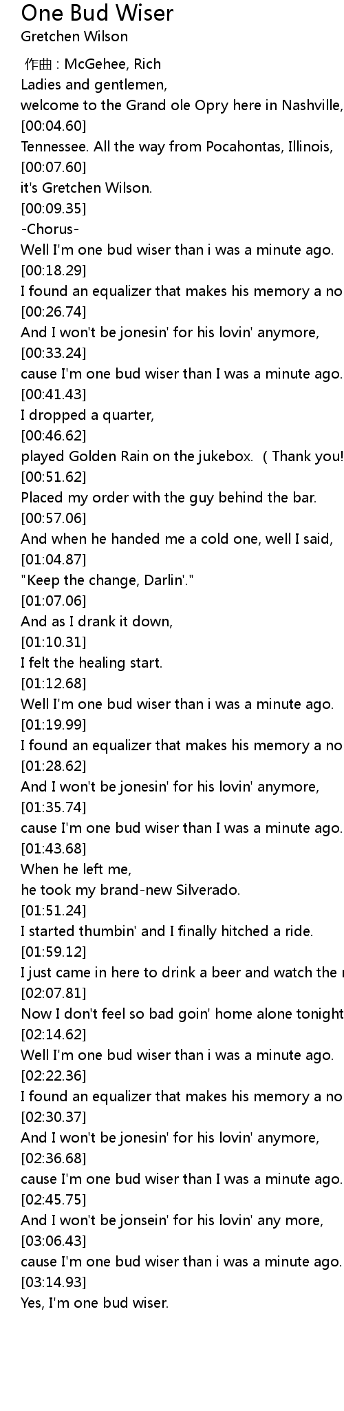 | [03:09.49] | cause I' m one bud wiser than i was a minute ago. |