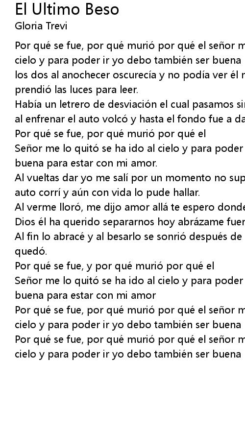 | Por que se fue, por que murio por que el se or me lo quito se ha ido al cielo y para poder ir yo debo tambie n ser buena para estar con mi amor. ibamos los dos al anochecer oscureci a y no podi a ver e l manejaba, iba a ma s de cien prendio las luces para leer. | |