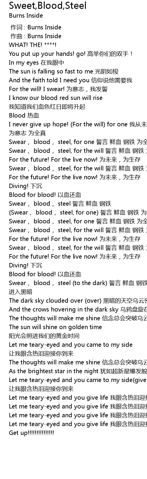 | [01:18.038] | Swear, blood, steel shì yán xiān xuè gāng tiě |