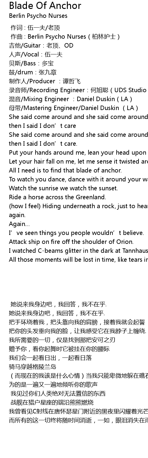 | [00:01.000] | zuò qǔ : Berlin Psycho Nurses bó lín hù shì |