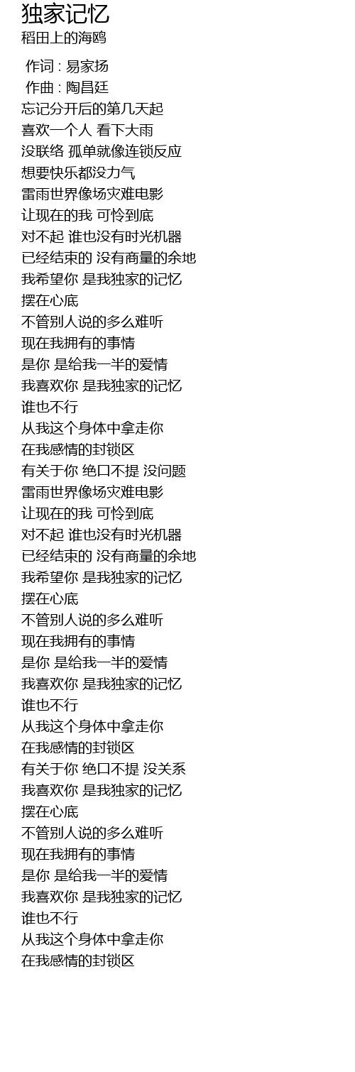 | [01:45.178] | 我喜欢你 是我独家的记忆 |