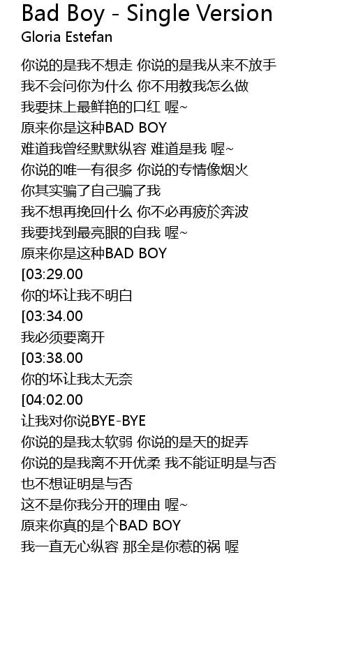 | [03:53.00][03:34.00][02:37.00][02:18.00][01:18.00] | BAD BOY BAD BOY wǒ bì xū yào lí kāi |