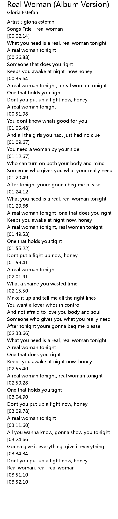 | [03:46.09] | Real woman, real, real woman |