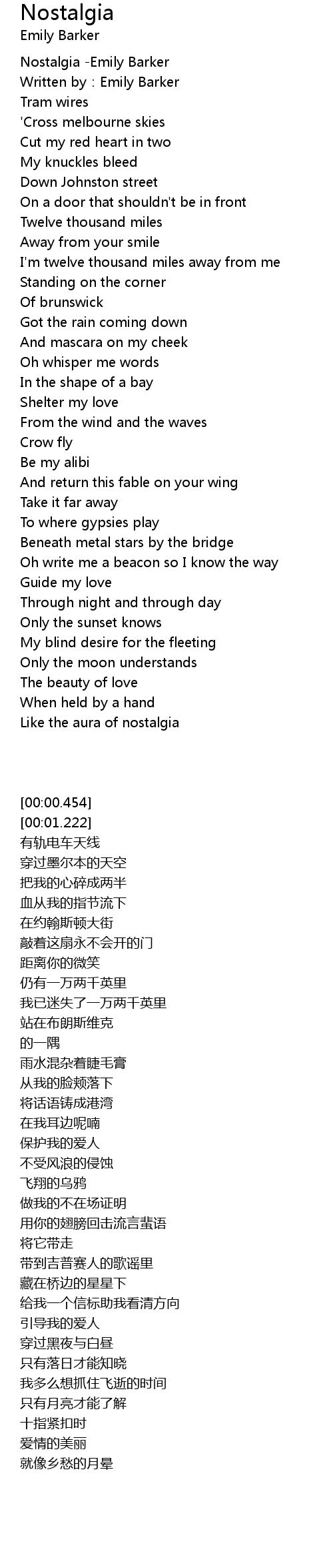 | [00:00.454] | Nostalgia Emily Barker |