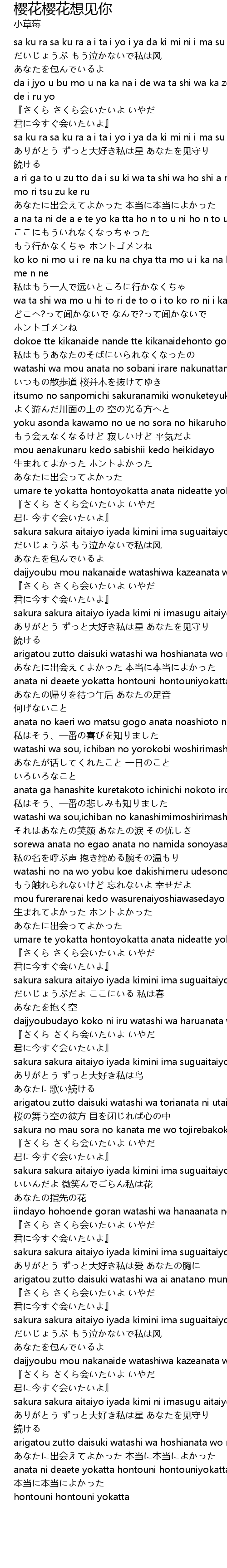 | [00:05.993] | sa ku ra sa ku ra a i ta i yo i ya da ki mi ni i ma su gu a i ta i yo |