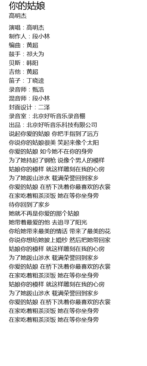 | [02:39.445] | nǐ ài de gū niáng zài qiáo xià xǐ zhe nǐ zuì xǐ huān de yī shang |