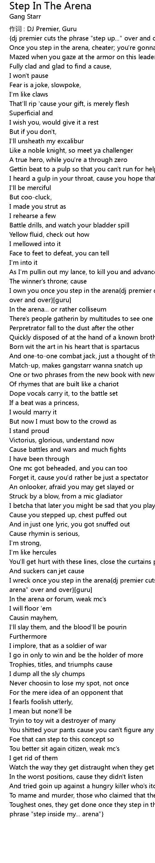 | I wreck once you step in the arena dj premier cuts the phrase " step inside my... arena" over and over guru | |
