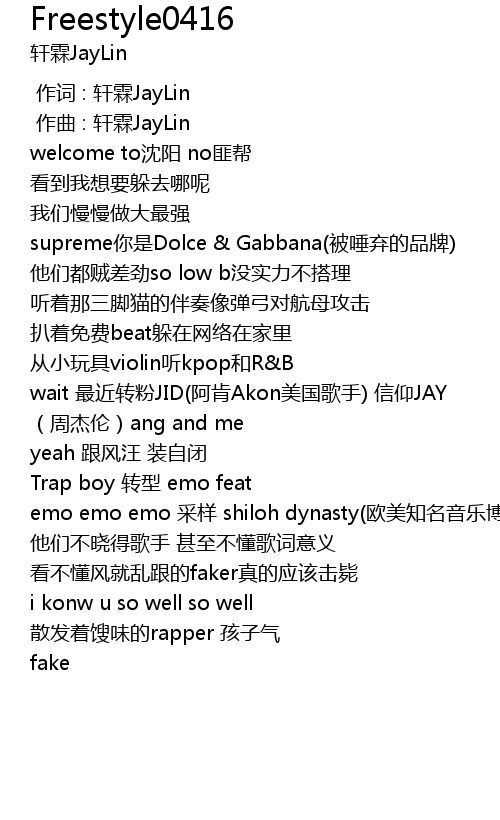 | [00:43.706] | wait 最近转粉JID(阿肯Akon美国歌手) 信仰JAY (周杰伦)ang and me |