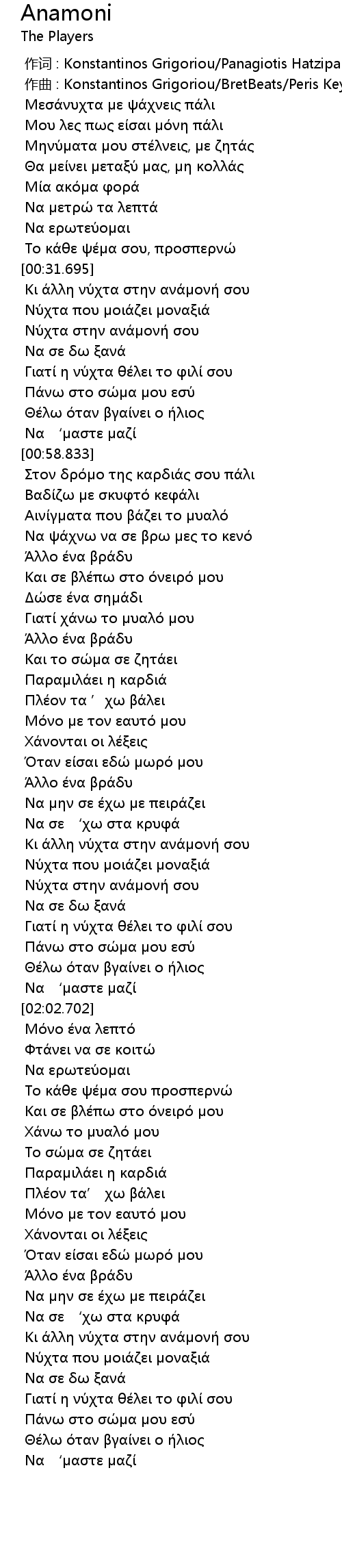 [00:00.000] 作词 : Konstantinos Grigoriou/Panagiotis Hatzipapas